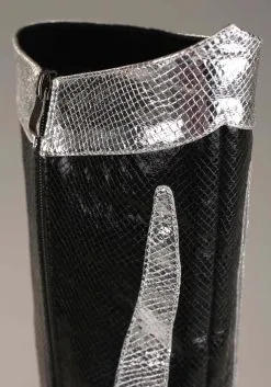 Rock and roll all night and party every day in these exclusive Catman KISS Boots! The black and silver knee-high boots are made of faux snakeskin and even have snake detail that will make you hiss with delight. They zip up the sides for easy wearing. Sky-high platforms just add to the fun.