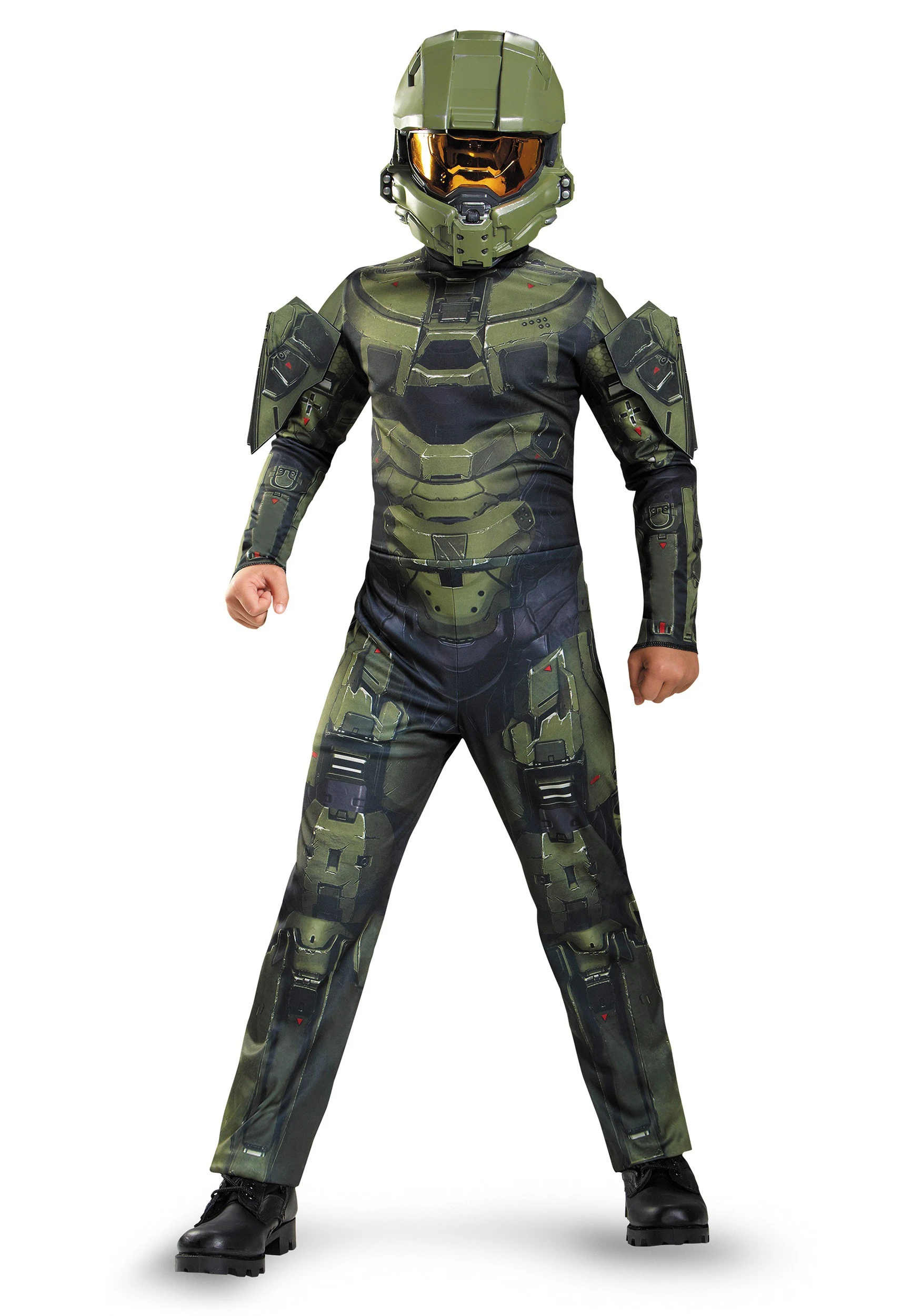 This kid’s Master Chief costume comes with everything your child needs to transform into the video game character this Halloween. The polyester jumpsuit has a Hook and Loop fastener closure in the back for easy on and off. The mask, Master Chief’s signature look, is made from hard molded plastic with an elastic band that secures around the back of the head. If you want to complete the look, be sure to add a toy gun accessory and a pair of black costume boots! Your child will look just like his favorite character this Halloween with our affordable costume!