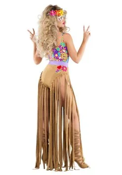 This laid back outfit comes with loose-fitting, brown, long sleeve shirt that has faux rawhide cord and fringe that runs along the bottom of the sleeves. The front also has beaded accents on the cord to add to the hippie vibes. The costume also comes with 2 pins which can be placed anywhere on the shirt, each with a hippie theme. Finally, you even get a headband to finish the whole look off. The headband has a tie-dye style and you can tie it around your head as you like! Just pair this up with your comfiest pair of jeans and you’ll be ready to head off to Woodstock.
