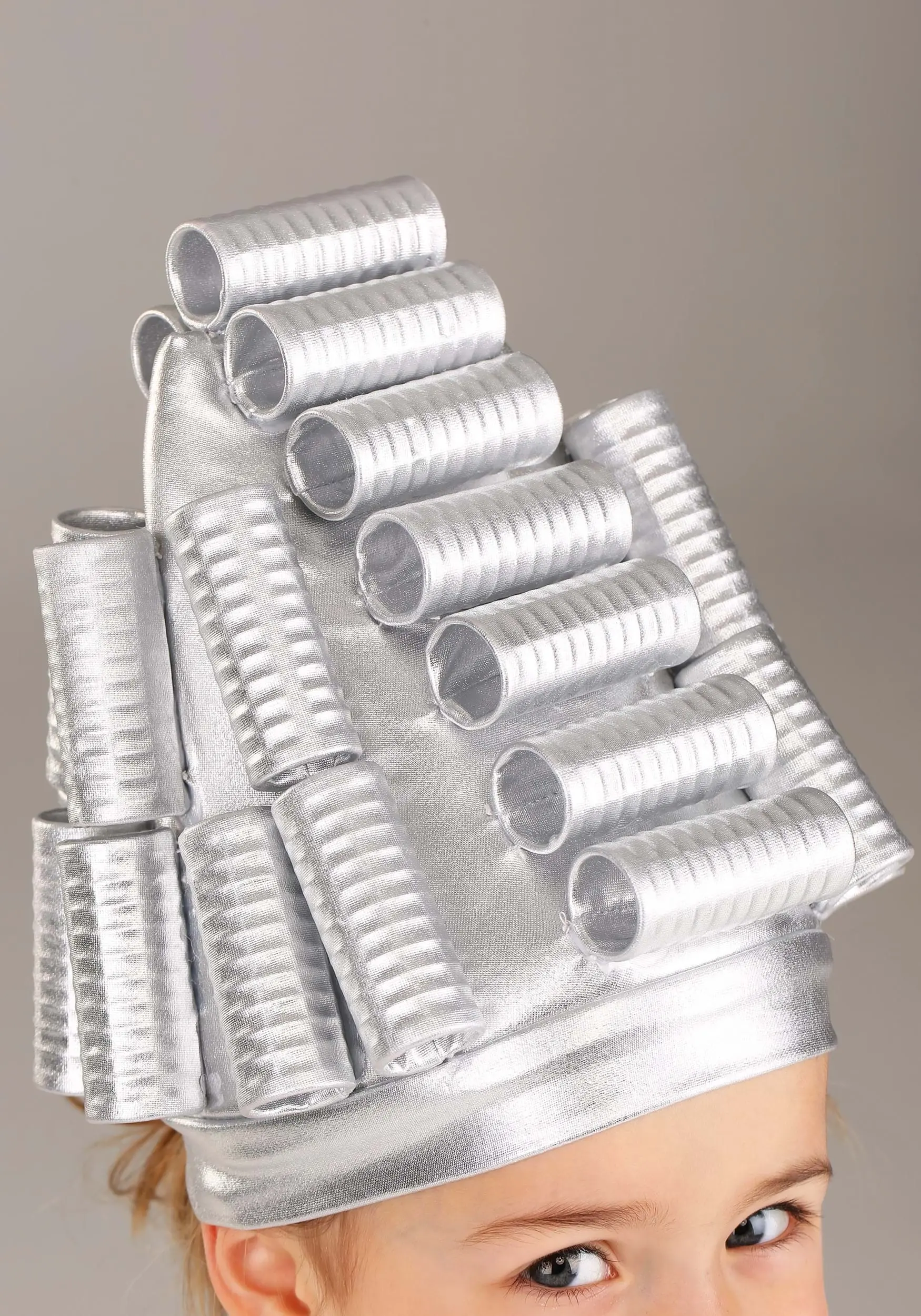 - Cone-shaped foam hat has plastic curlers all over the outside