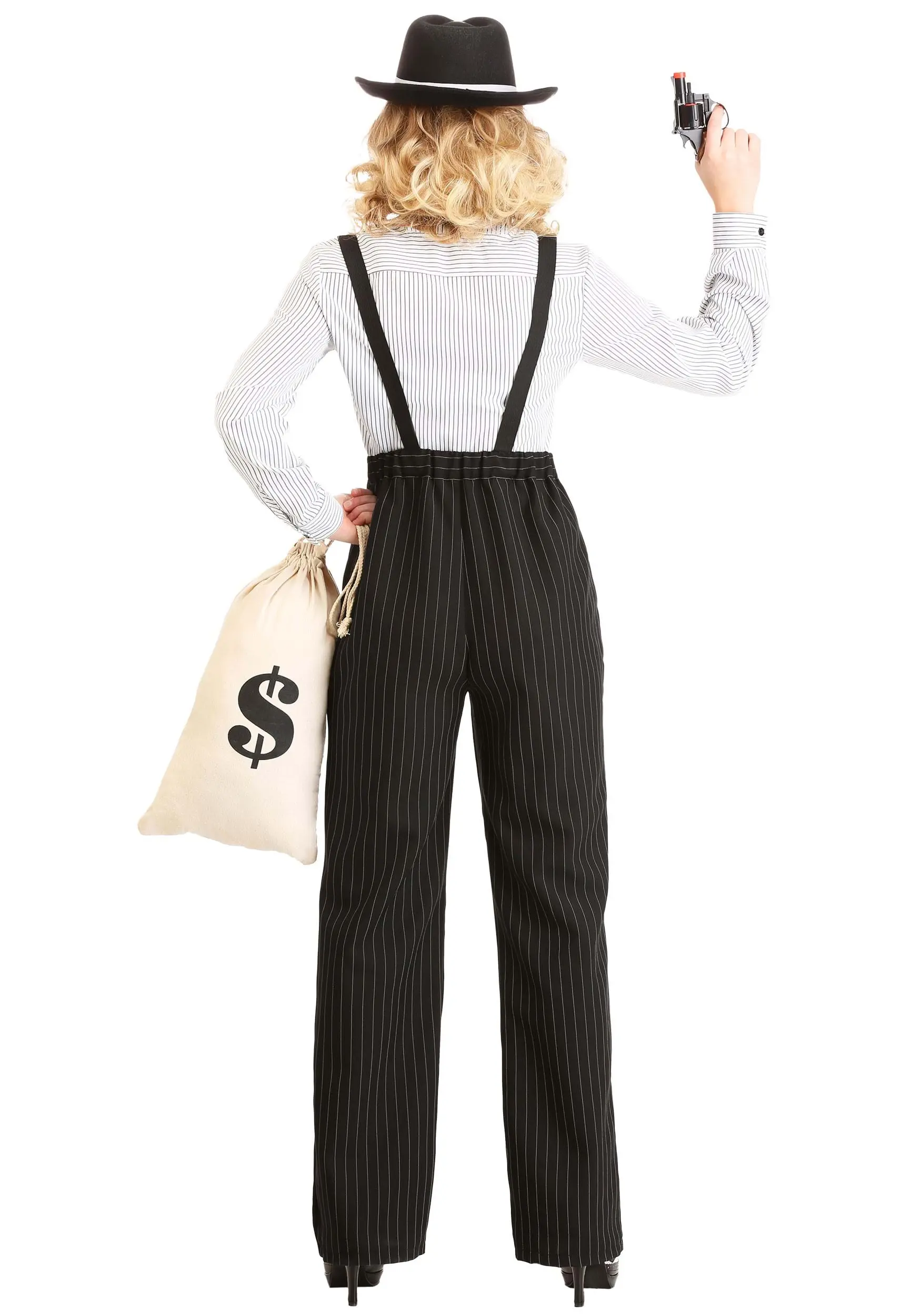Introducing our HalloweenCostumes 1920s Gangster Lady Costume. Another top-flight selection straight out of our costume design studios, our team of artists and product designers sought out to make a sexy gangster costume just for women. It had to pass for a look that would have been typical in the mobster era of the Roaring 20s, but as a costume it’s got to be a whole lot of fun, too. This costume delivers! It is designed as a shirt and pants set, including attached suspenders. The white shirt has dark pinstripes, and the high-waisted black pants have light pinstripes. The pants have attached suspenders in the back, and each suspender clips onto the front when worn over the shoulders. Just pick up a fedora to complete the look!