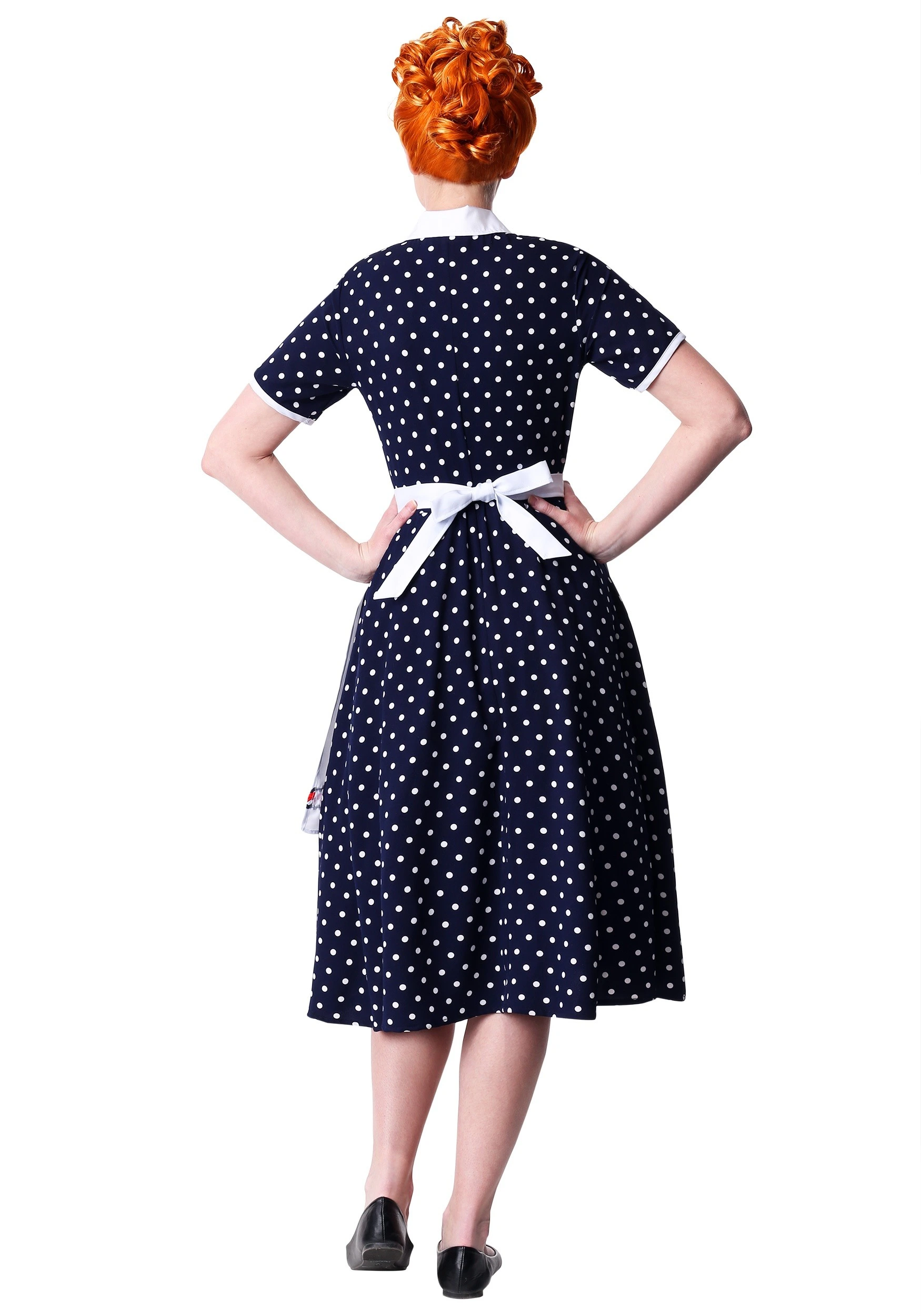 We teamed up with I Love Lucy to bring you this officially-licensed, straight-from-the-show look…but in full color! Sure, Lucille Ball wears some fun getups throughout the show’s seasons, but nothing says “classic Lucy” like a shirtdress and apron. So, that’s what we’ve brought you, because we want you to look—and feel—iconic. This costume includes a collared, button-up, polka-dot dress with white detailing and a white half-apron. The apron has the show’s heart logo that says “I Love Lucy,” so you and everyone else will know it’s official. Top it off with our I Love Lucy wig and a pair of retro heels or ballet flats, and cook up a great scheme to make some comedy magic happen!