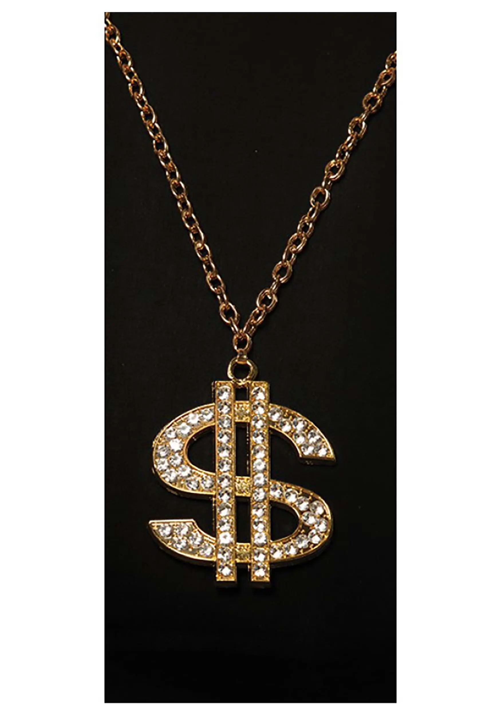 Flaunt your wealth with this Pimp Dollar Sign Adult Necklace! A gold-tone pendant shaped like a dollar sign dangles from a matching chain. No need to hire a bodyguard while wearing it: Instead of diamonds, the pendant flaunts sparkly, clear-colored rhinestones.